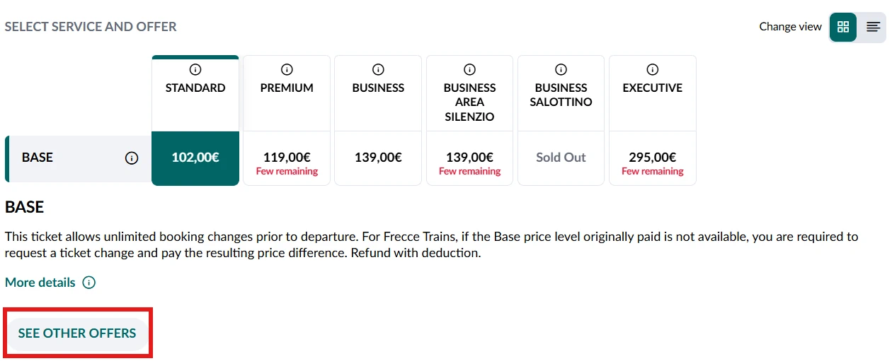 Standard: Comparable to 2nd class.Premium: 1st class, 2–2 seating. In Frecciarossa 1000 includes welcome drink and snacks (except Saturdays). Requires a 1st class FIP pass.Business: 1st class, 2–1 seating. In Frecciarossa 1000 includes welcome drink and snacks (except Saturdays). Not bookable with FIP.Executive: Luxury class with private compartment for 10 people and meeting room. Not bookable with FIP.
